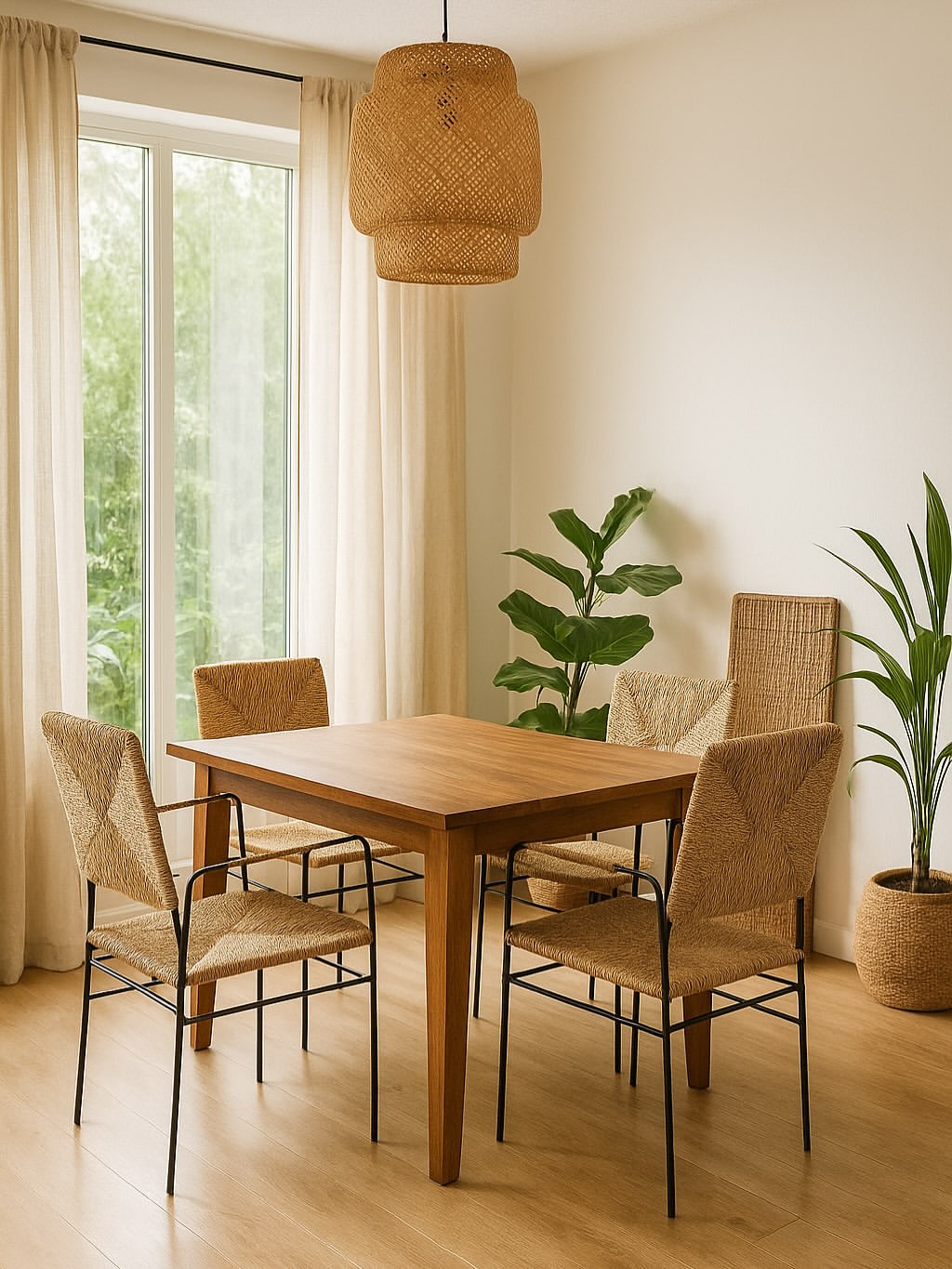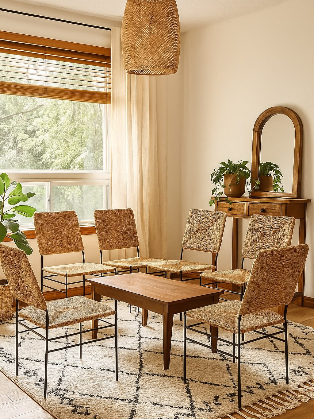 ترکیبی از طبیعت، هنر دست و طراحی مدرن این ست صندلی حصیری با ساختاری مقاوم از فلز مشکی مینیمال و نشیمن و پشتی دستبافت از الیاف طبیعی حصیر، جلوهای گرم و دلنشین به هر فضا میبخشد. طراحی آن الهامگرفته از سبک بوهو مدرن است؛ سبکی که سادگی، بافت طبیعی و حس آرامش را در کنار هم قرار میدهد.